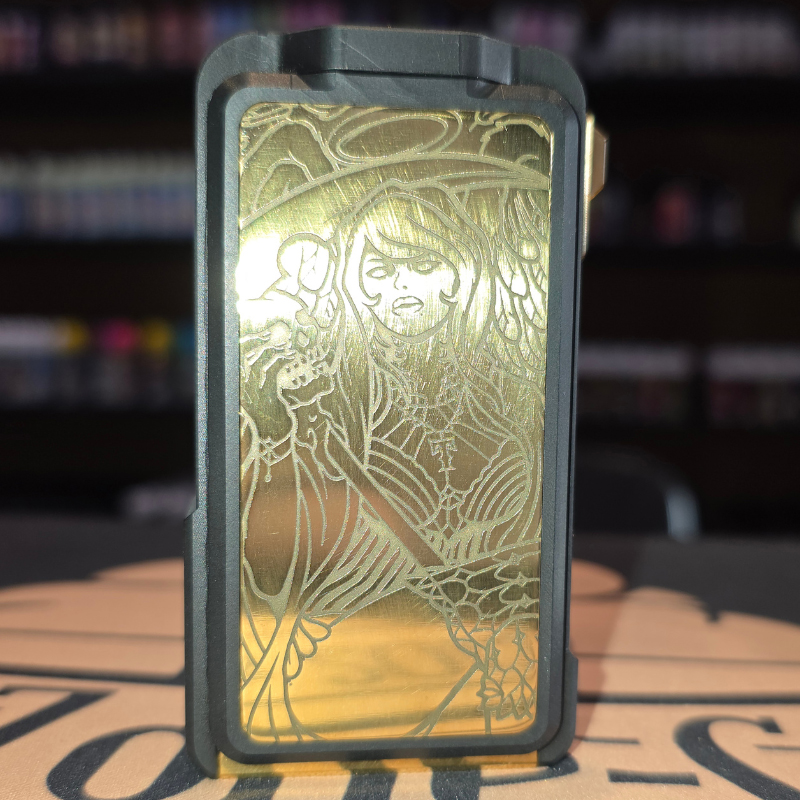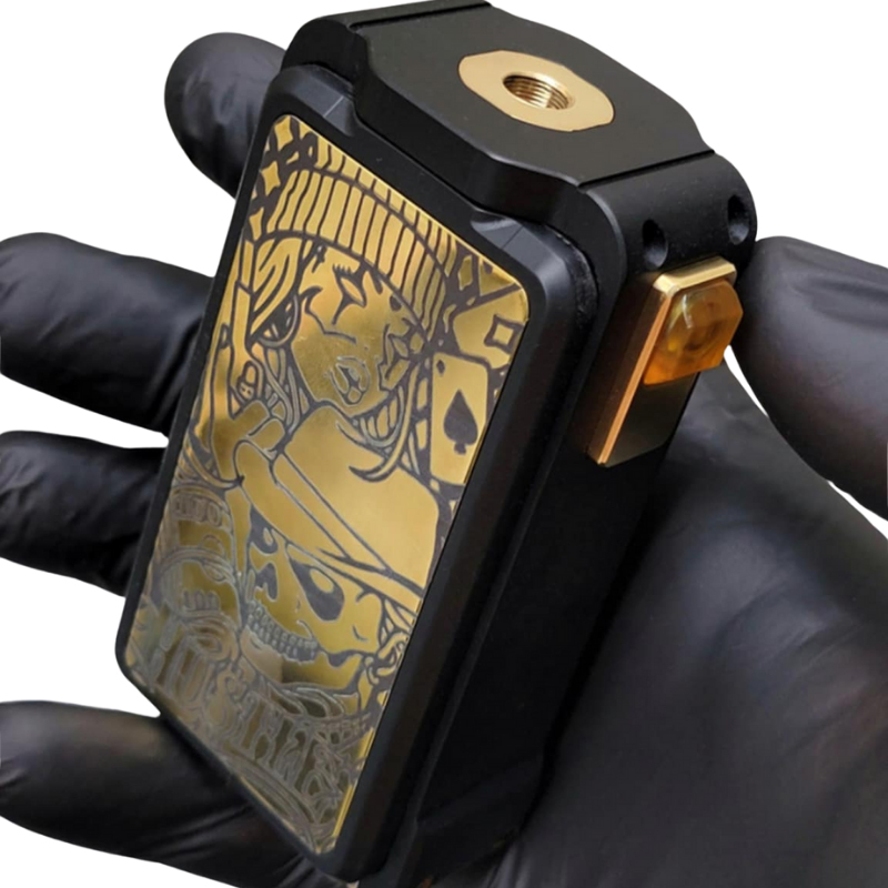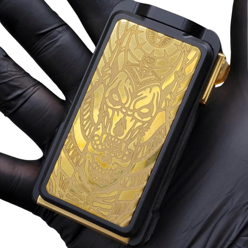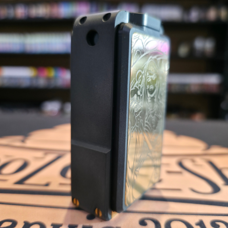 Le Doomsday V4 est composé d’un corps en Delrin mat, encadré de plaques latérales en laiton gravé au laser, ce qui lui confère à la fois robustesse, légèreté et esthétique brute. Les gravures sur les portes magnétiques donnent à chaque mod une allure unique et agressive.